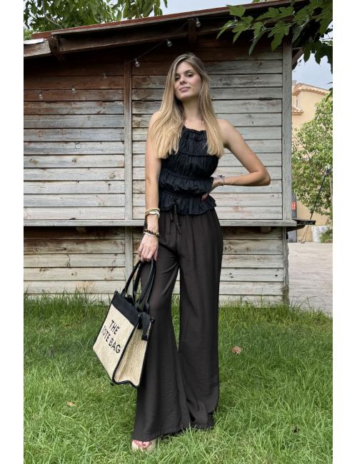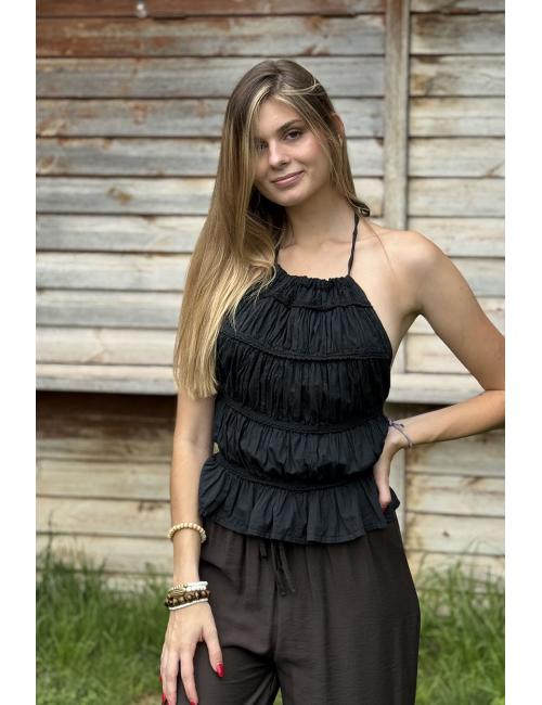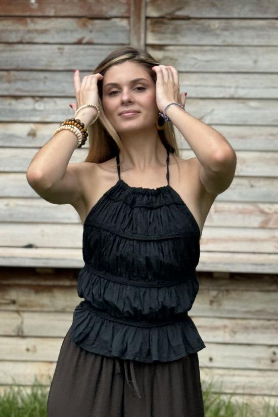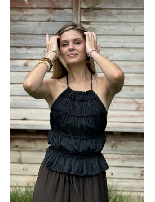 Top with ruffles in boho style. Halter neck which is tied at the back with two thin straps. Including adjustable horizontal straps at the back.