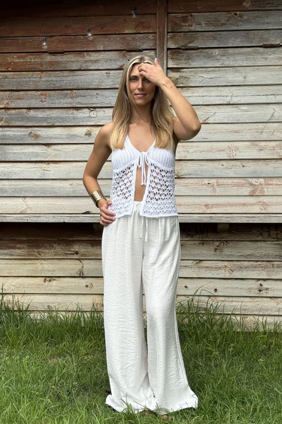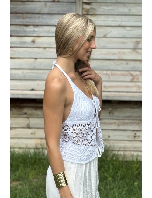 Sleeveless open crop top, made with dense crochet on the chest and openwork on the bottom. Adjustable with straps tied at the neck and a bow at the front neckline. Semi-open back. The perfect crop top for your boho chic outfits, ideal with palazzo trousers, shorts and skirts.