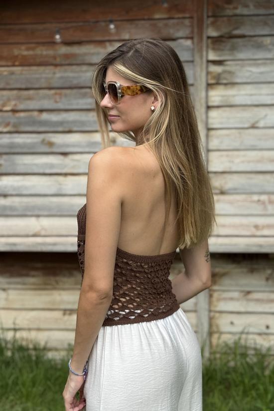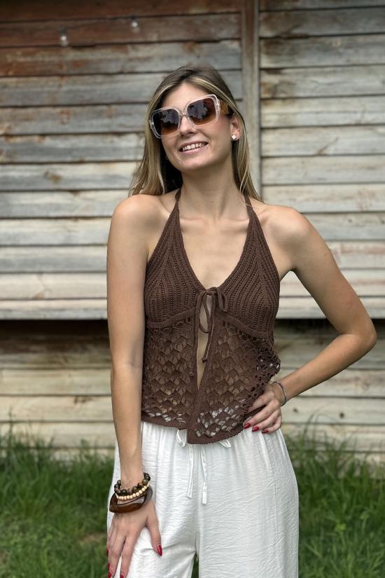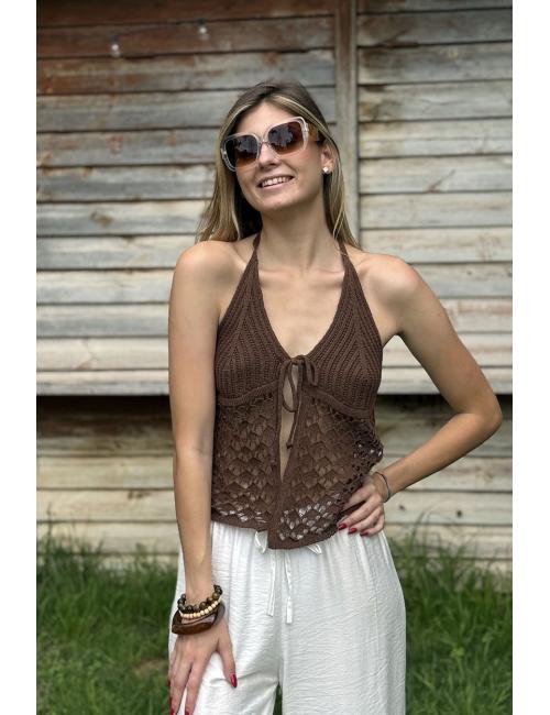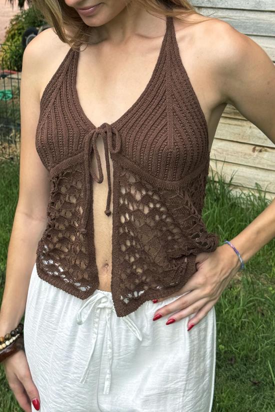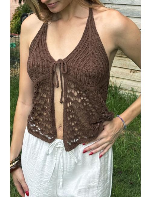 Brown open crochet top
