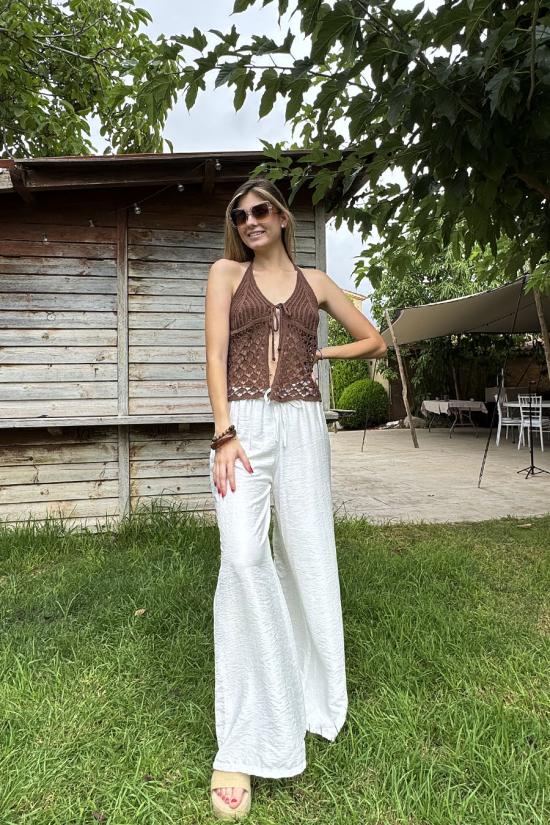 Sleeveless open crop top, made with dense crochet on the chest and openwork on the bottom. Adjustable with straps tied at the neck and a bow at the front neckline. Semi-open back. The perfect crop top for your boho chic outfits, ideal with palazzo trousers, shorts and skirts.