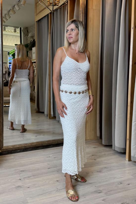 Elasticated top made from embroidered tulle. Adjustable straps for a better fit. Moulded cups and gathered detail at the front. Boat neckline and open back.
