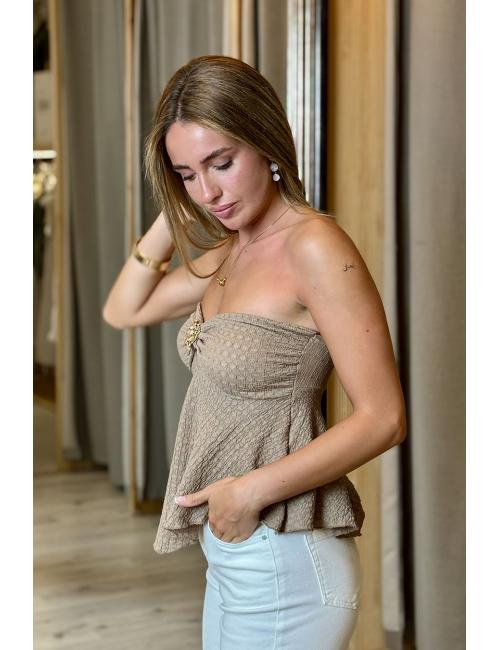 Stretchy top with a strapless neckline and gathered front. Features a metallic gold flower detail at the neckline and cups at the bust. Flowing hem with an irregular shape.