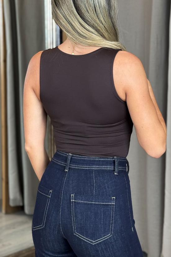 Fitted sleeveless bodysuit with metallic gold detailing at the centre of the neckline. Made from thick, smooth stretch fabric. Fastens with metal press studs. A versatile garment that can be paired with any outfit.