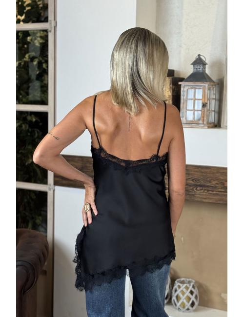 Satin slip top. Asymmetrical hem and side slit. V-neck, thin straps and lace trim detail at the hem and neckline. The most versatile garment of the season, ideal for your daytime looks with jeans or leggings and for evening wear on its own or with simple tights.