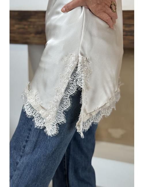 Satin slip top. Asymmetrical hem and side slit. V-neck, thin straps and lace trim detail at the hem and neckline. The most versatile garment of the season, ideal for your daytime looks with jeans or leggings and for evening wear on its own or with simple tights.