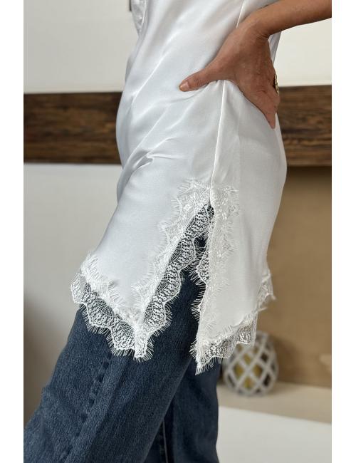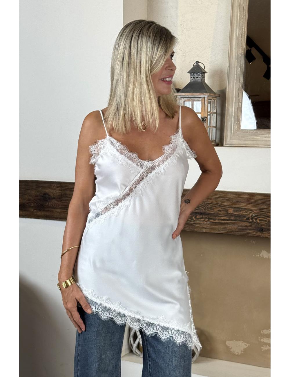 Satin slip top. Asymmetrical hem and side slit. V-neck, thin straps and lace trim detail at the hem and neckline. The most versatile garment of the season, ideal for your daytime looks with jeans or leggings and for evening wear on its own or with simple tights.
