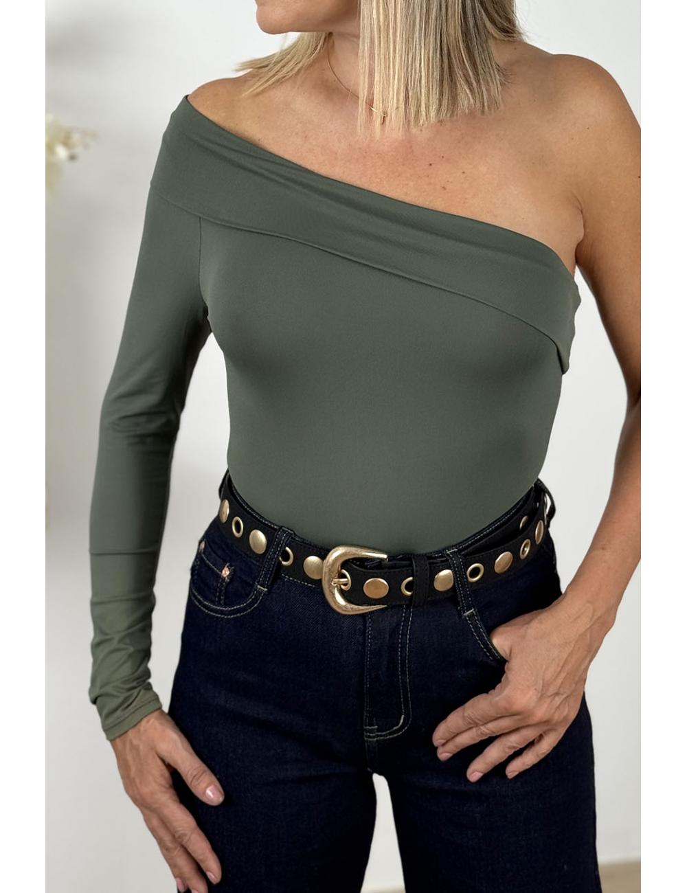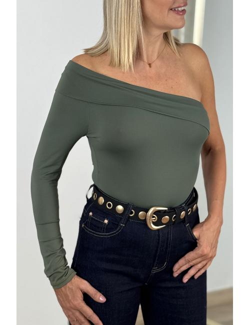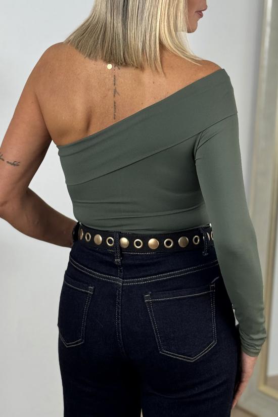 Fitted bodysuit made from thick stretch fabric. It is asymmetrical, with a single long sleeve and a roll neck. Fastens with metal press studs. Ideal for pairing with jeans and skirts, it is a comfortable garment that flatters your figure.