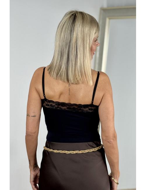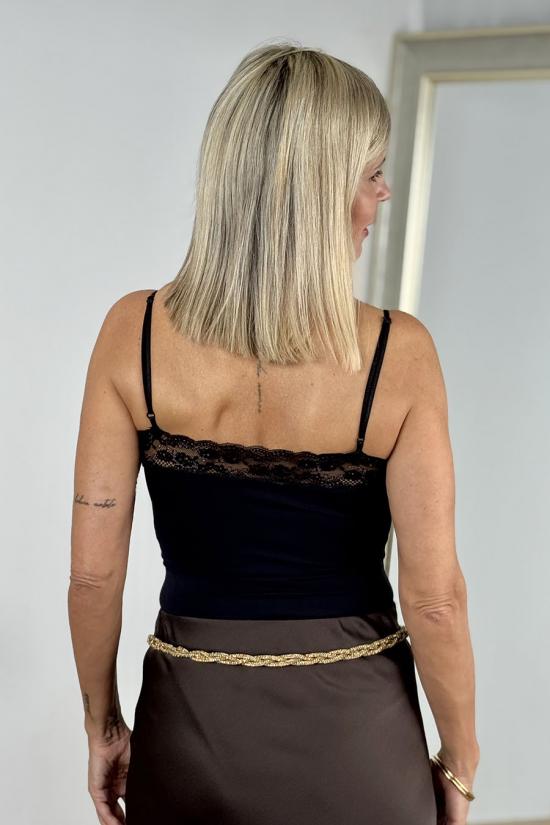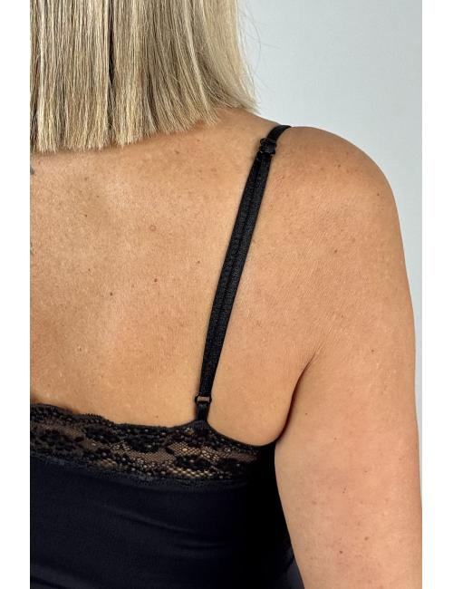 Stretch bodysuit made from stretch satin fabric. Thin, adjustable straps. Lace detail on the top, both front and back. V-neckline and snap button closure at the bottom.
