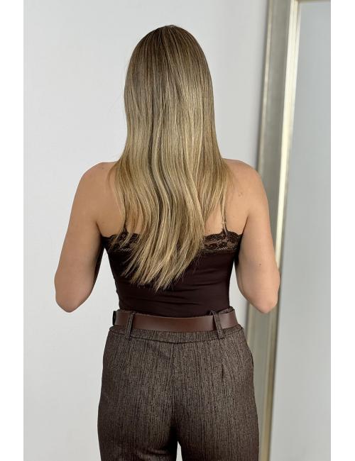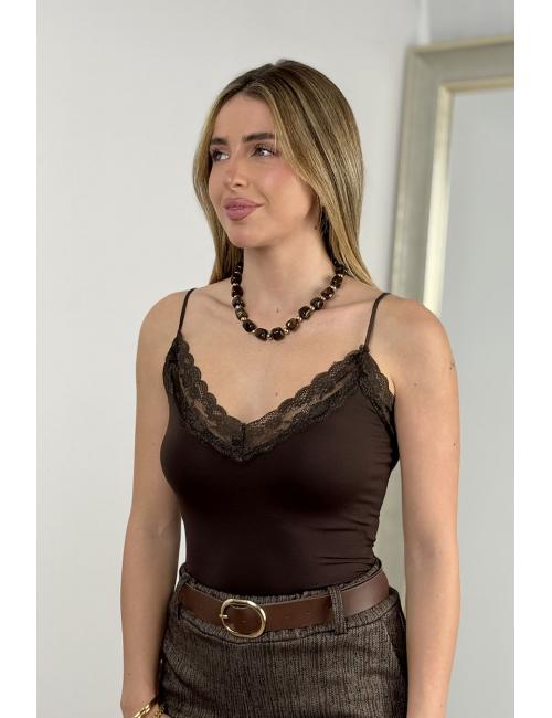 Stretch bodysuit made from stretch satin fabric. Thin, adjustable straps. Lace detail on the top, both front and back. V-neckline and snap button closure at the bottom.