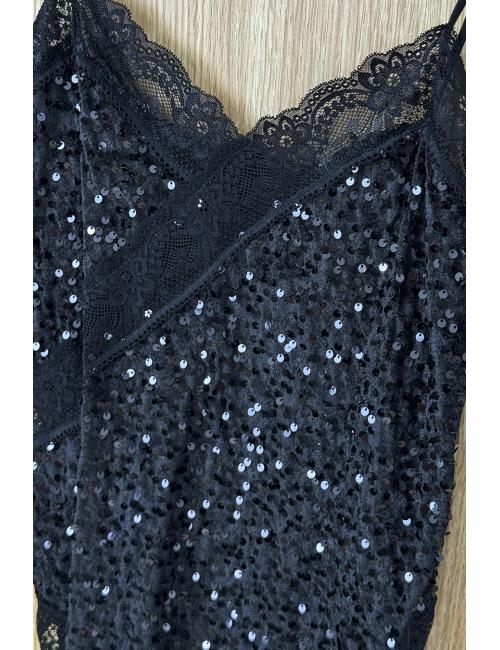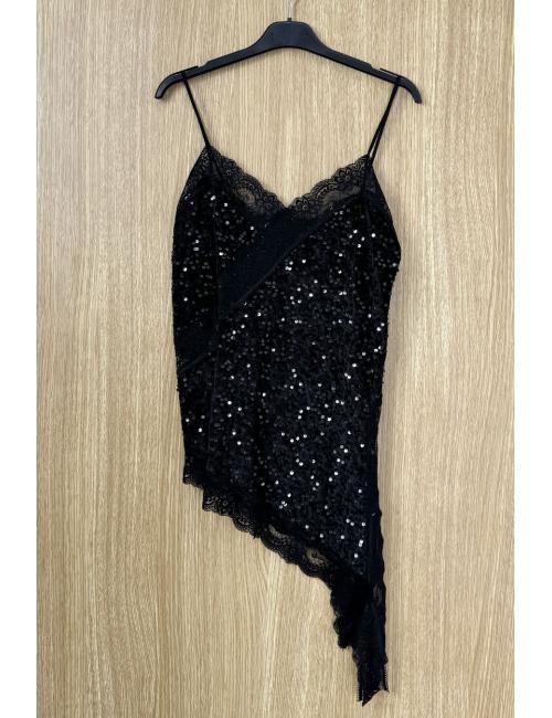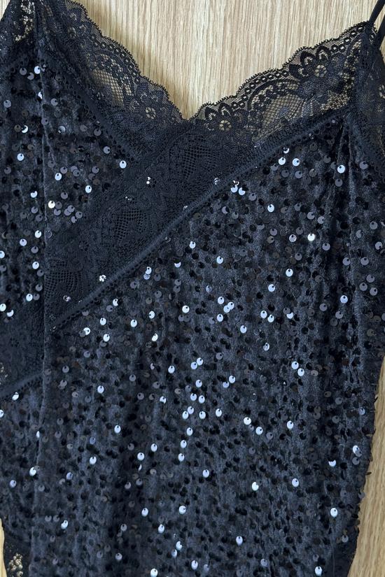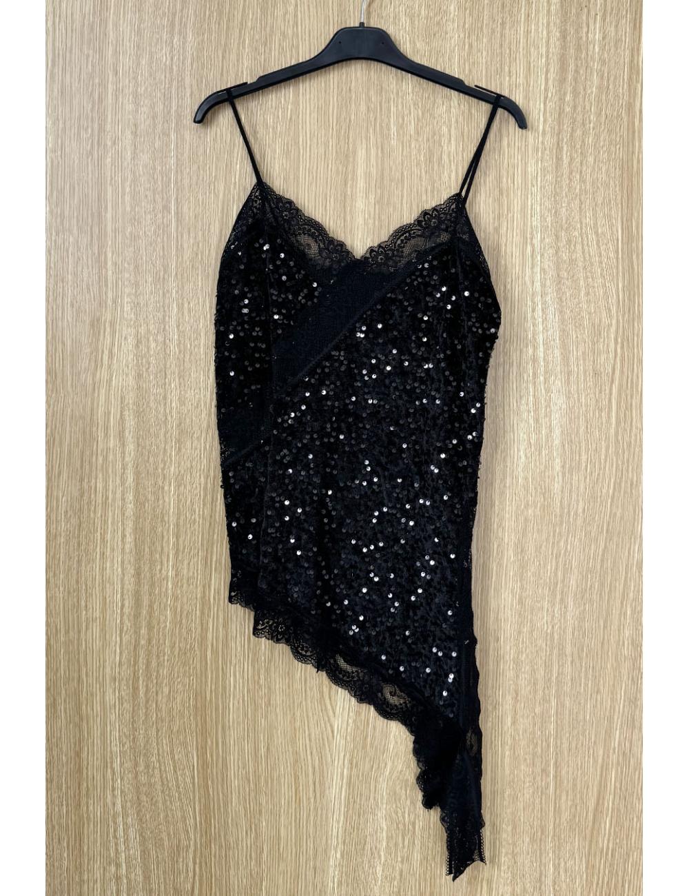 Velvet slip top lined with sequins. Asymmetrical hem and side slit. V-neck, thin straps and lace trim detail at the hem and neckline.