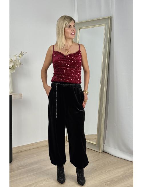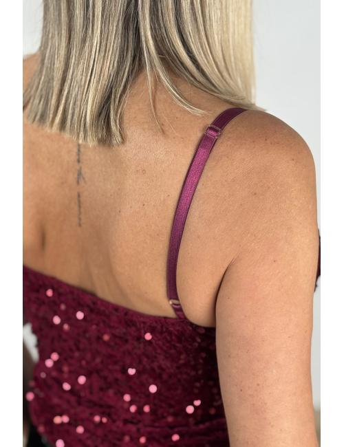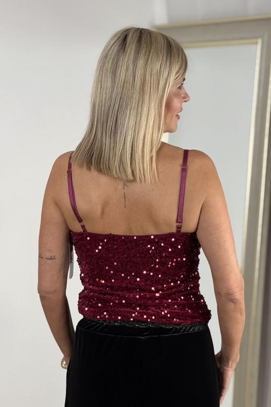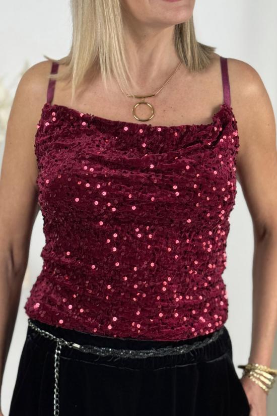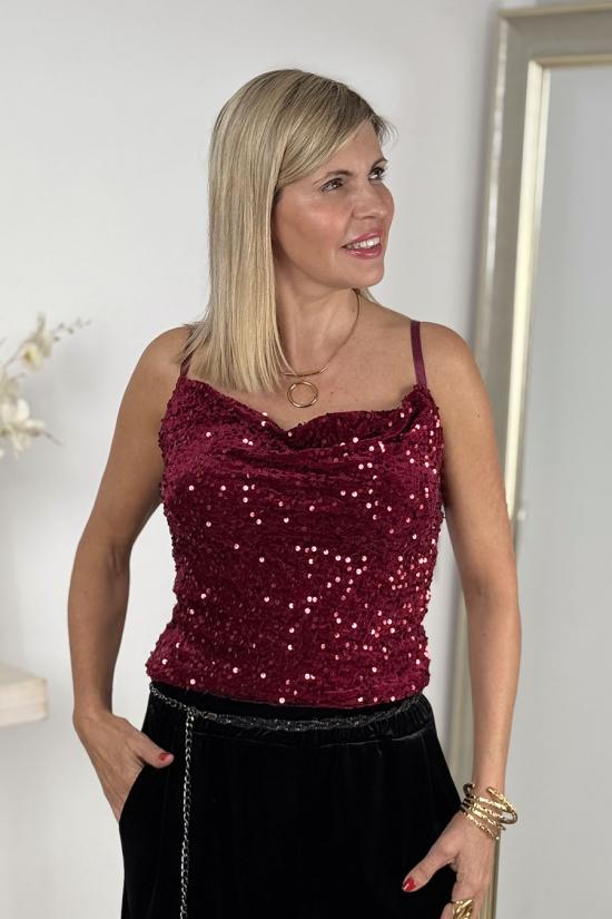 Sequin-covered velvet top. Straight hem and drop neckline. Thin, adjustable straps. Your go-to top for the festive season that you can wear all year round for events and celebrations.