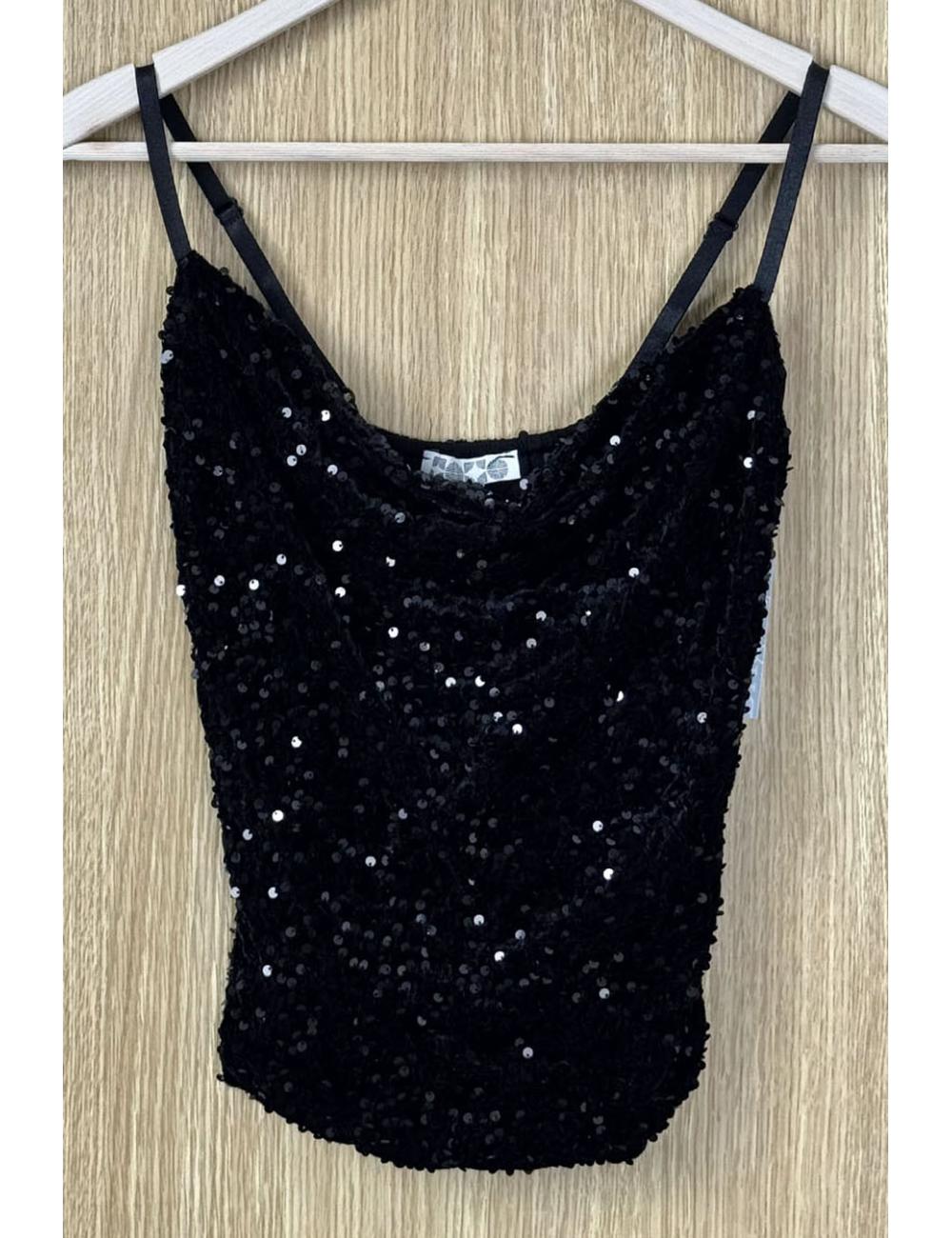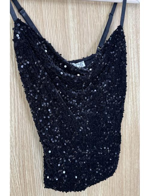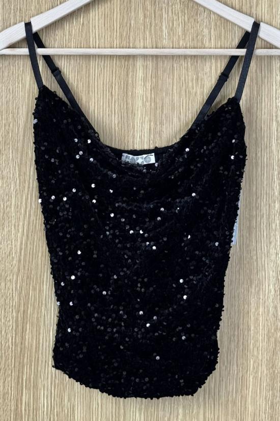 Sequin-covered velvet top. Straight hem and drop neckline. Thin, adjustable straps. Your go-to top for the festive season that you can wear all year round for events and celebrations.