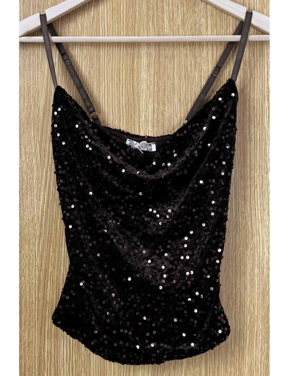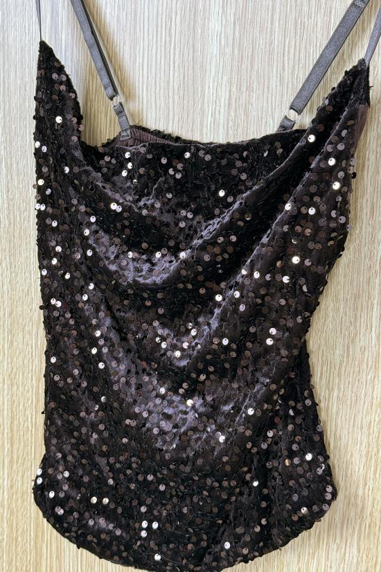 Sequin-covered velvet top. Straight hem and drop neckline. Thin, adjustable straps. Your go-to top for the festive season that you can wear all year round for events and celebrations.
