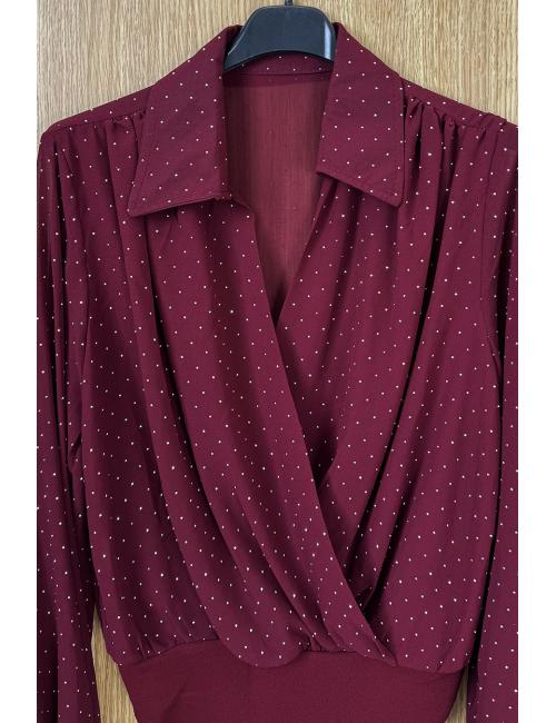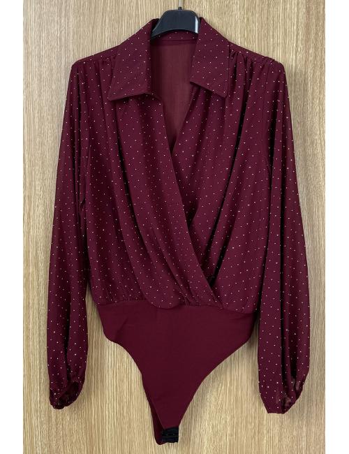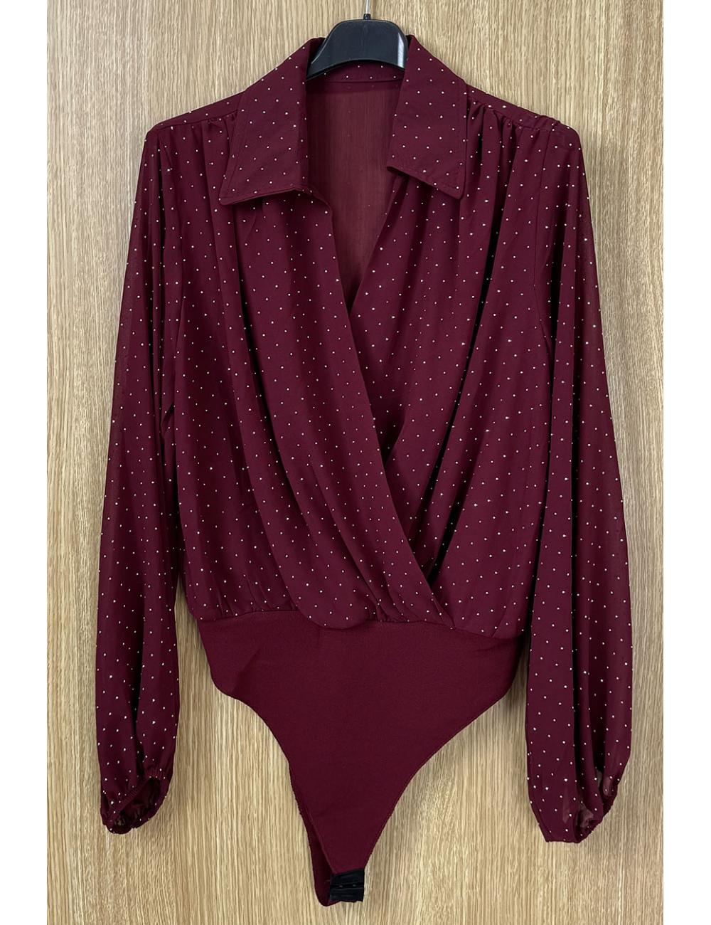 Stretch bodysuit made from semi-transparent gauze. Shirt collar and long sleeves with elasticated cuffs. Rhinestone detailing throughout. Fastens at the hem with metal hooks and comes in three sizes.