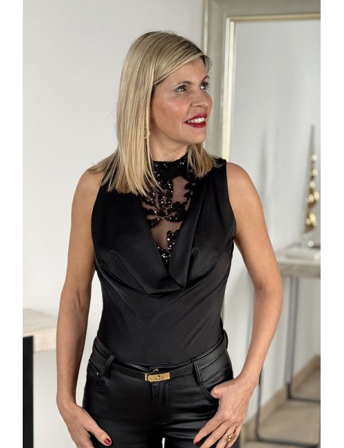 Sleeveless bodysuit made from stretchy, shimmering satin fabric and semi-sheer tulle with sequins. Features a waterfall neckline and a halter neck that ties at the back with two buttons. Includes a small keyhole detail at the back.