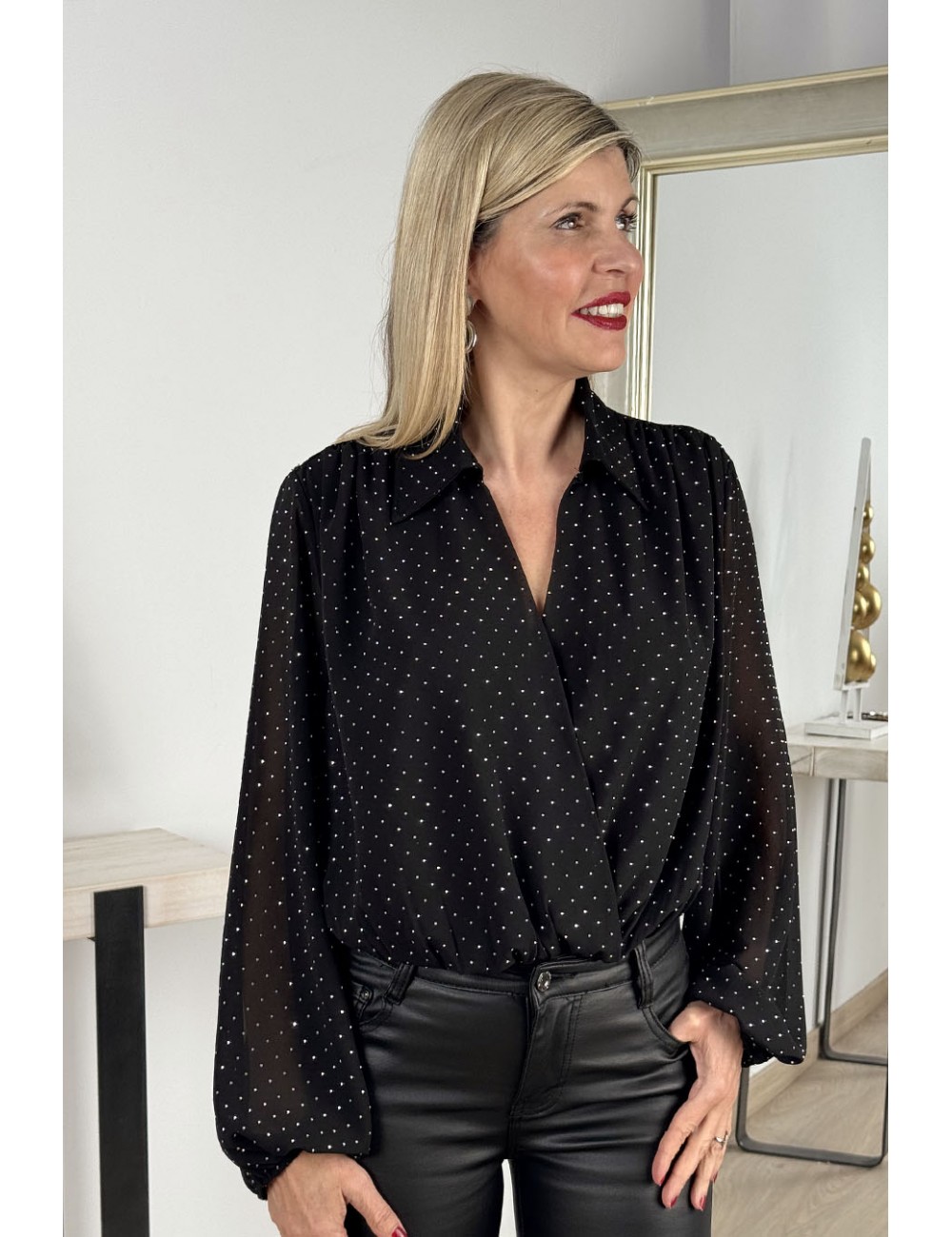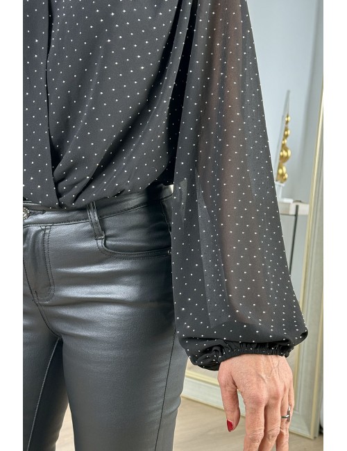 Stretch bodysuit made from semi-transparent gauze. Shirt collar and long sleeves with elasticated cuffs. Rhinestone detailing throughout. Fastens at the hem with metal hooks and comes in three sizes.