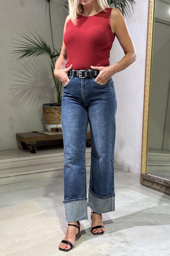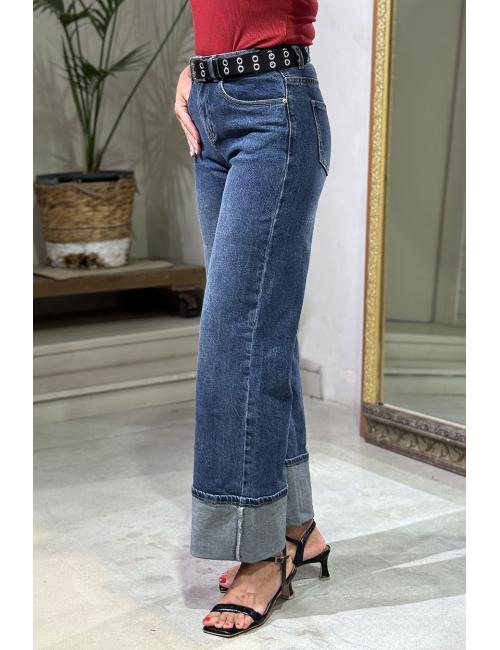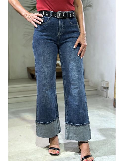 Wide leg, high rise, cuffed blue wash jeans. Made from stretch denim fabric. Straight wide leg. Belt loops at the waist. Five pockets, front and back. Zip and metal button fastening.