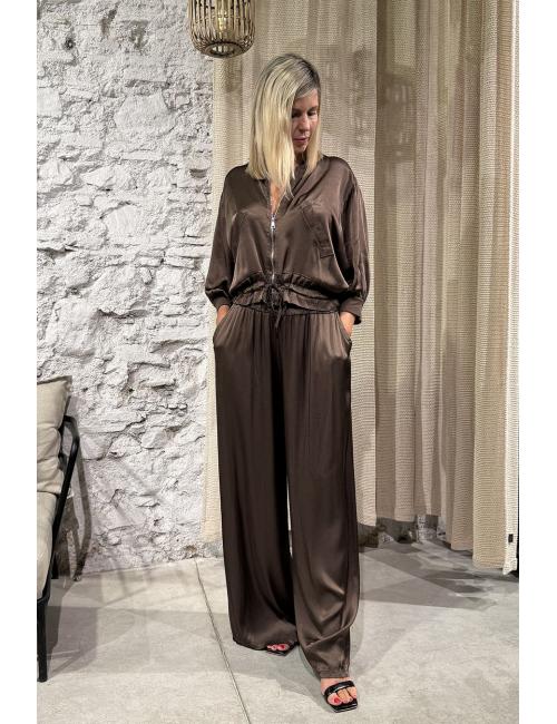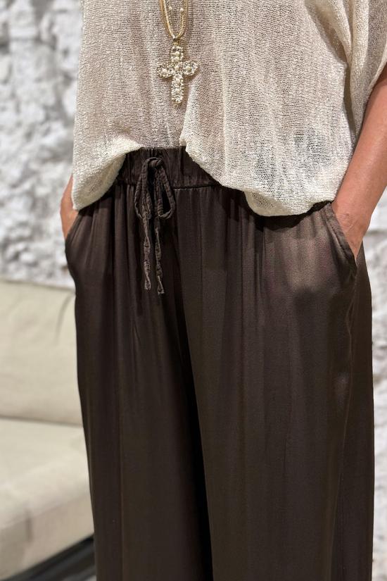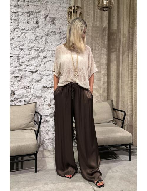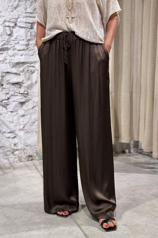 Flowing satin palazzo trousers. Elasticated waistband adapts to various sizes.