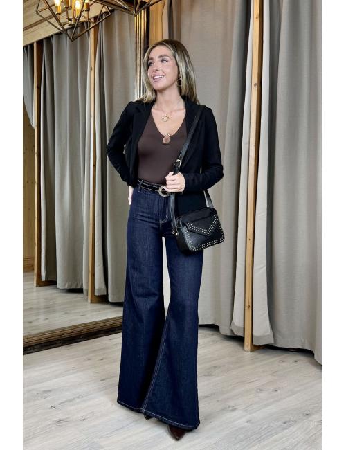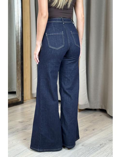High-waisted wide leg jeans with a flared cut. No front pockets and two back pockets. Made from stretch denim fabric. Belt loops at the waist and contrasting ochre stitching. Front zip fastening with metal button.
