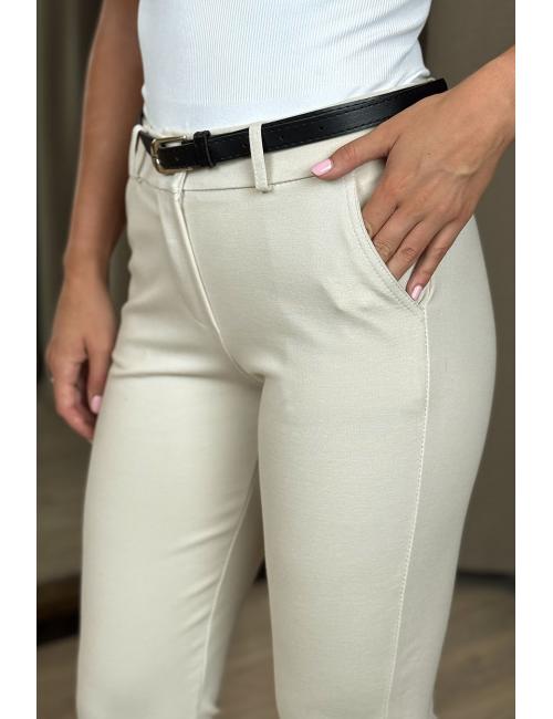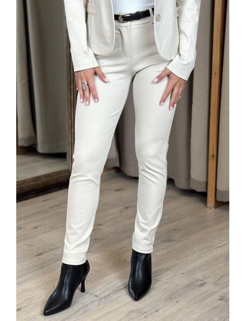 Suit trousers made from stretch rib knit fabric. Mid rise, two side pockets and one back pocket. Includes faux leather belt with metal buckle.