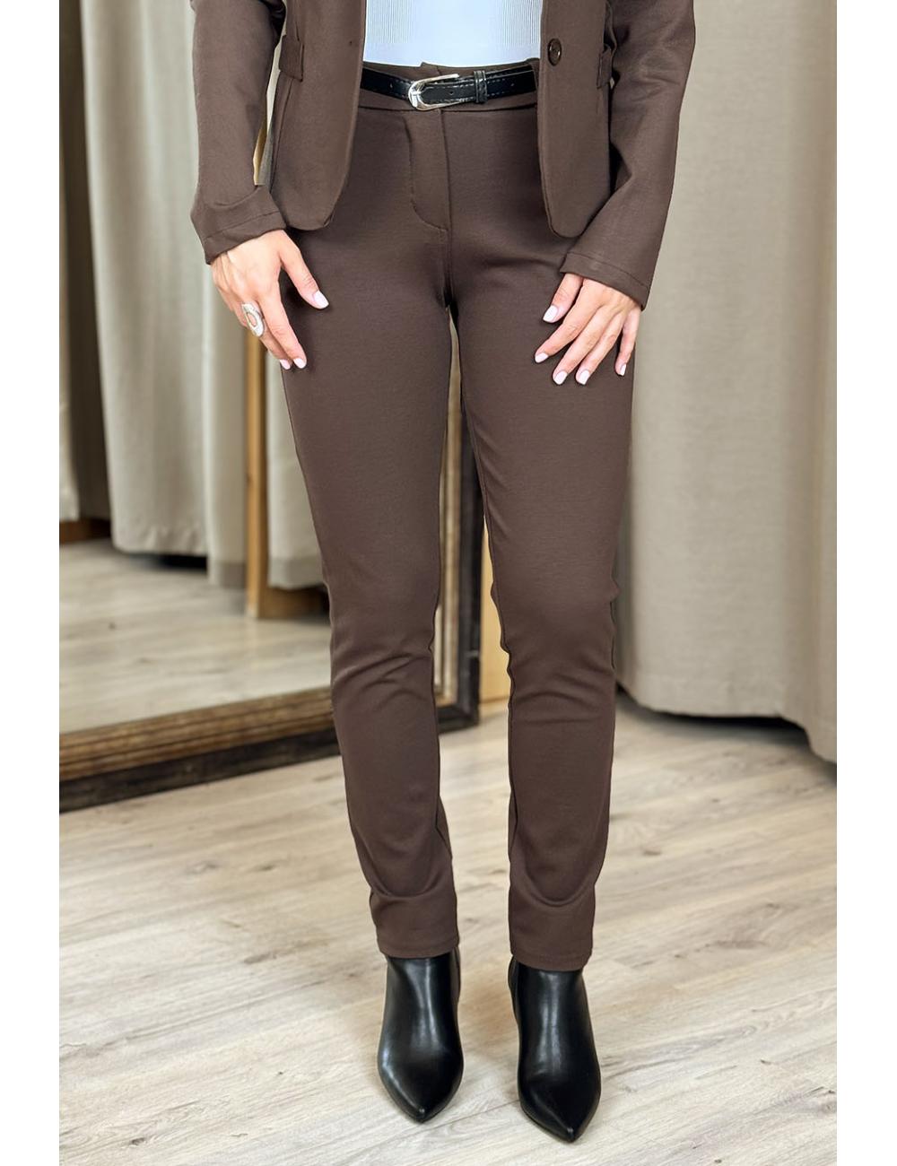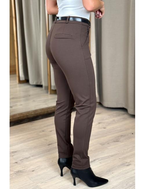 Suit trousers made from stretch rib knit fabric. Mid rise, two side pockets and one back pocket. Includes faux leather belt with metal buckle.