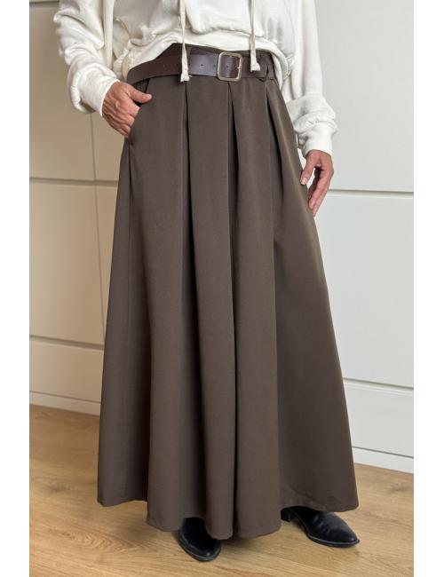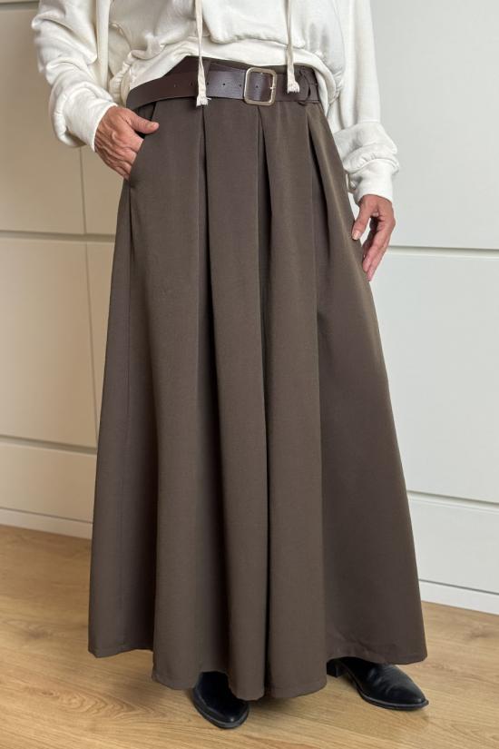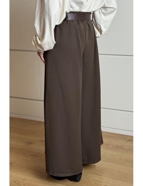 High-waisted palazzo trousers with pleats and a skirt effect. Wide belt detail with metal buckle that enhances the waist. Two side pockets. A garment that combines all the comfort of trousers with the elegance of a skirt.