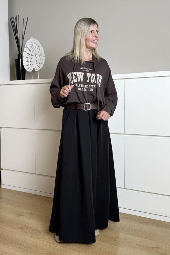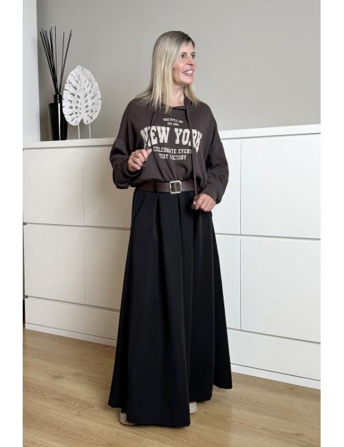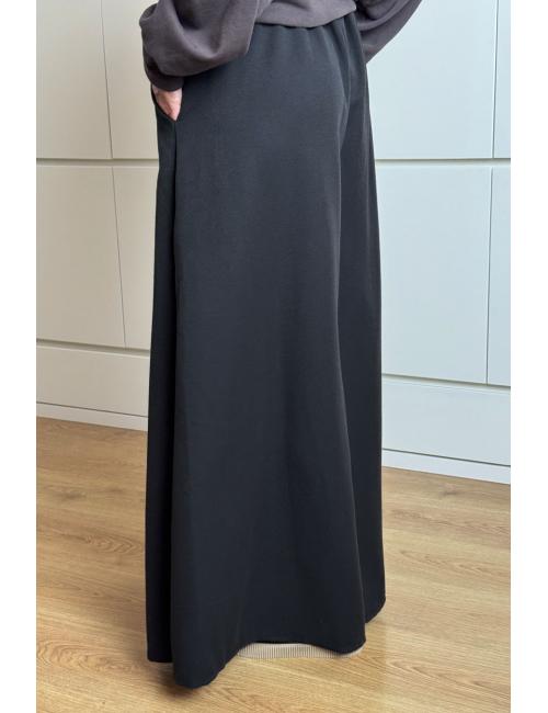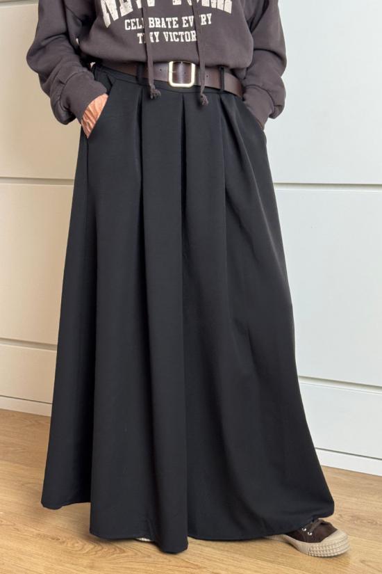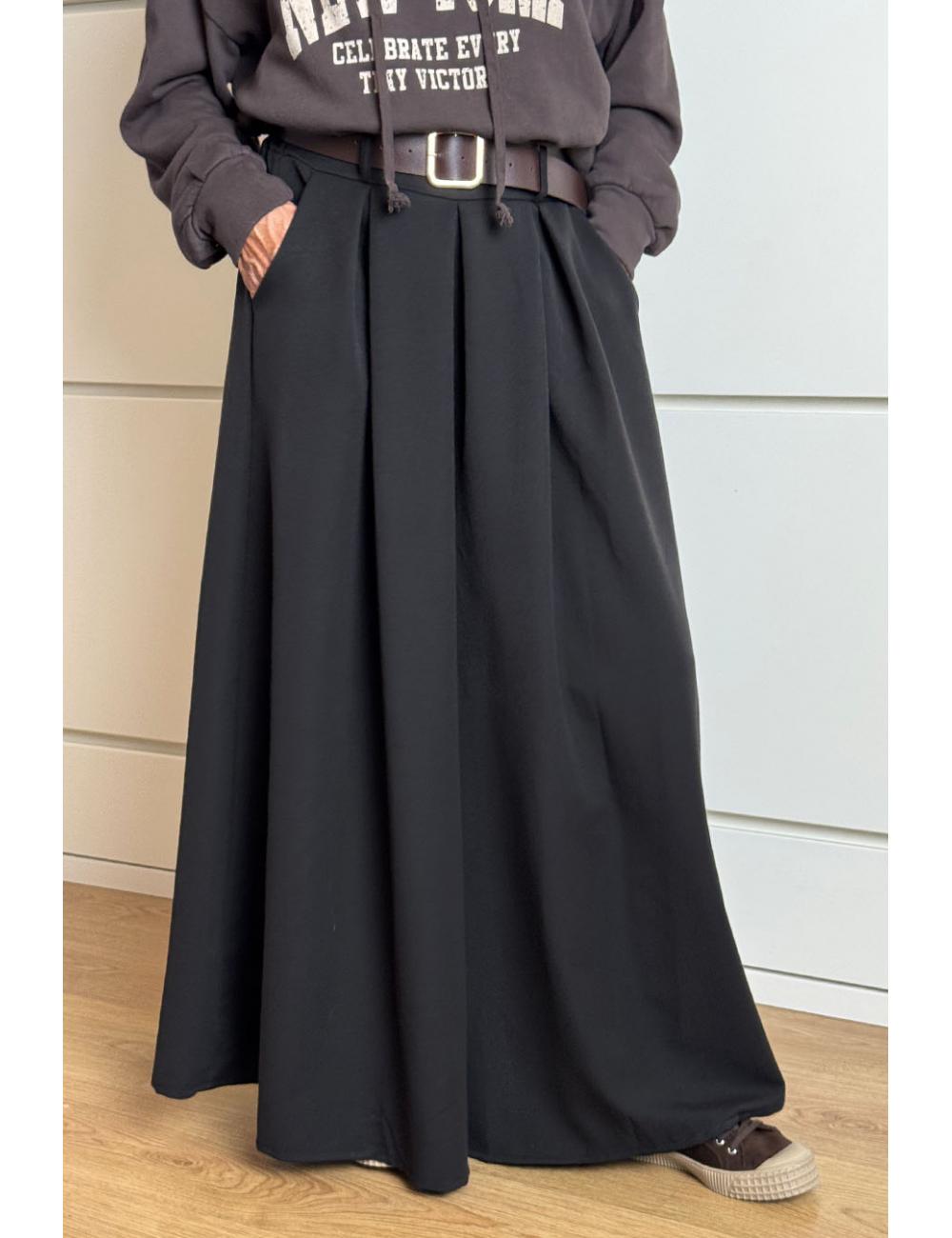 High-waisted palazzo trousers with pleats and a skirt effect. Wide belt detail with metal buckle that enhances the waist. Two side pockets. A garment that combines all the comfort of trousers with the elegance of a skirt.