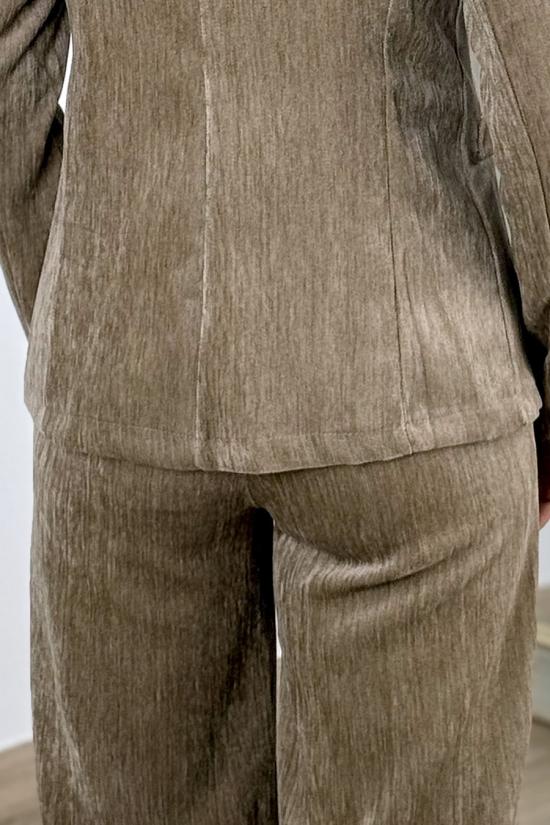 Suit trousers made from extra-soft velvet fabric. Straight cut and mid-rise. Two side pockets and faux leather belt with gold buckle.