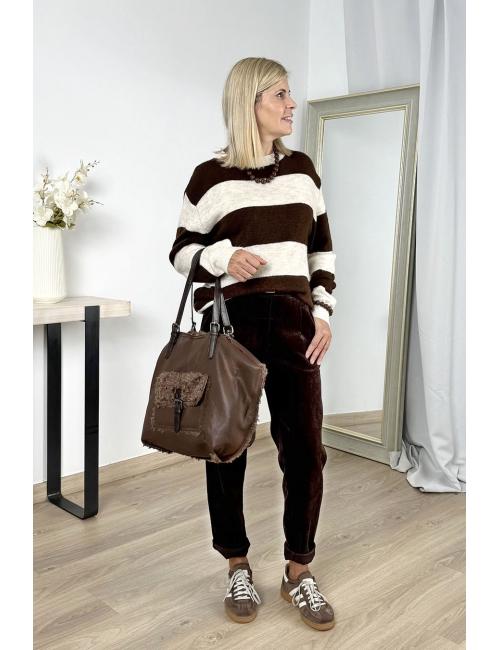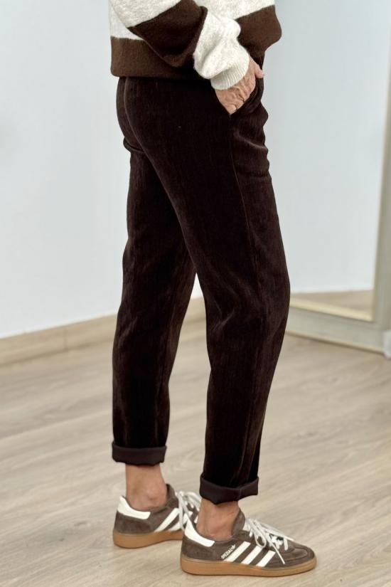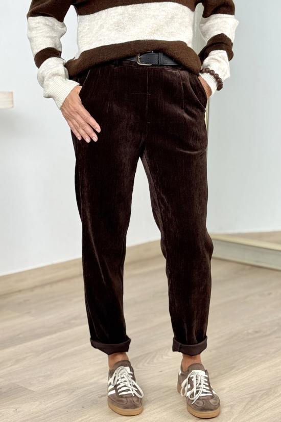 Trousers in extra-soft velvety fabric. Jogger cut and mid-rise. Two side pockets and faux leather belt with silver buckle.