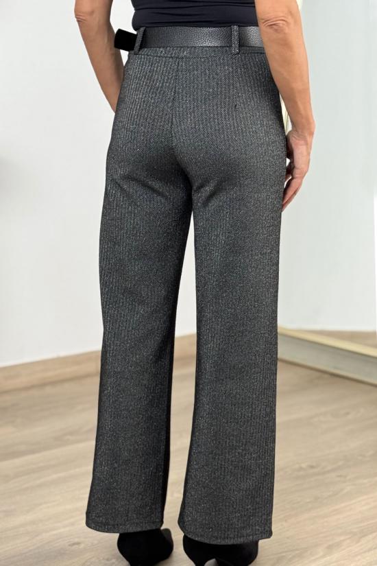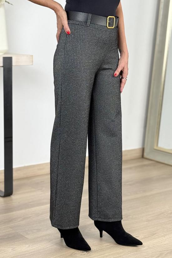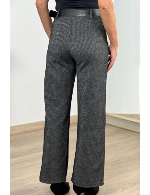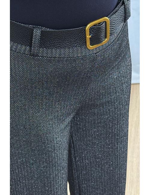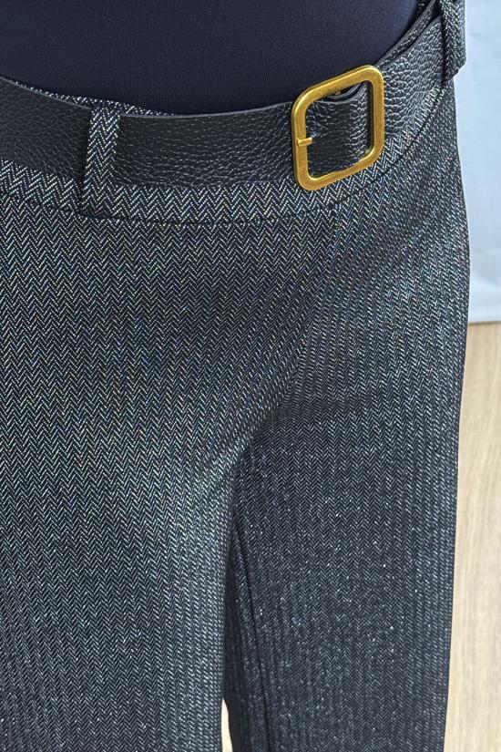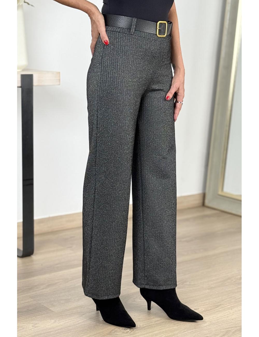 Suit trousers made from stretch knit fabric combined with shiny lurex in a herringbone pattern. Palazzo cut and mid-rise. Includes a faux leather belt with a gold buckle.