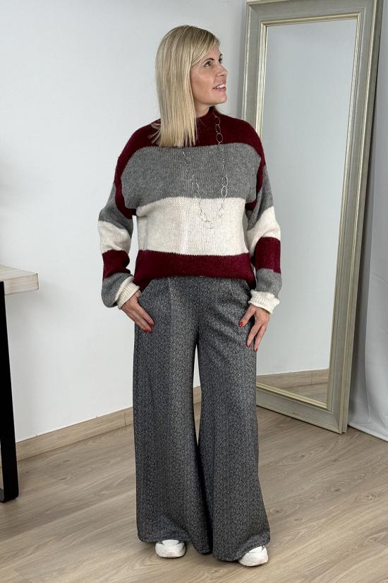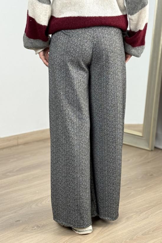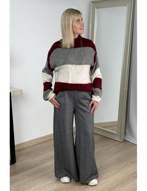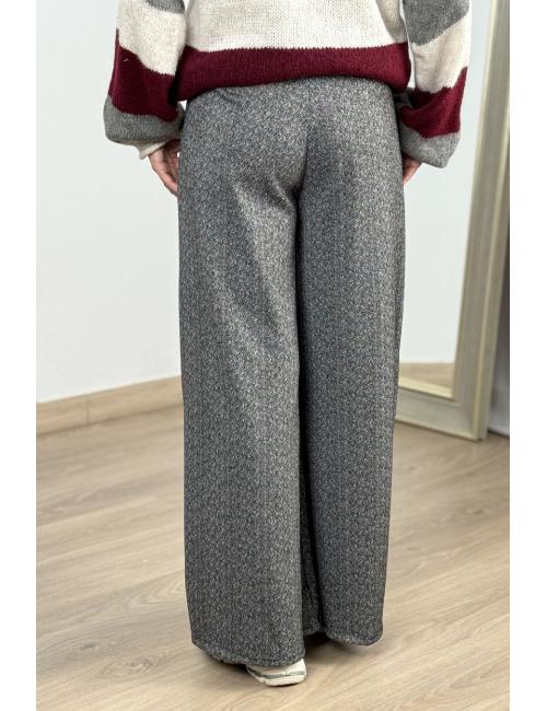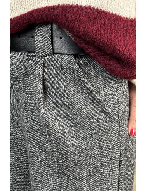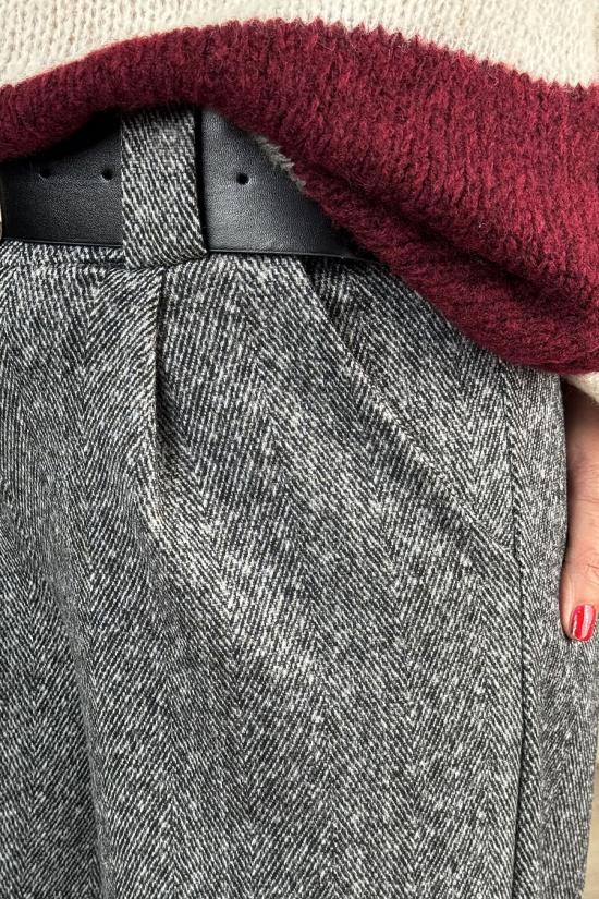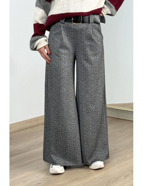 Palazzo trousers made from extra-soft, stretchy fine wool. High waist, two side pockets, belt loops and wide brown faux leather belt with gold buckle. Elasticated waistband adapts to various sizes.