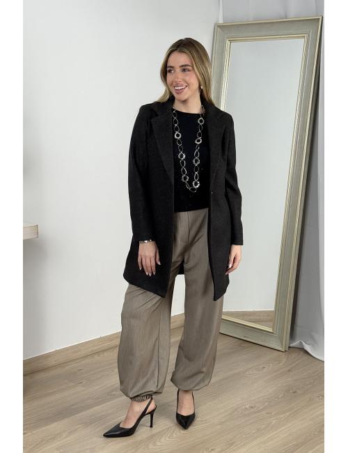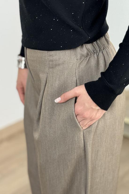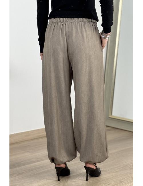 Balloon-cut trousers with front pleats and elasticated hem. Mid-rise, two side pockets and elasticated waistband to fit several sizes. Original, elegant, modern trousers with a bohemian touch.