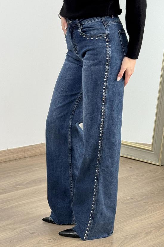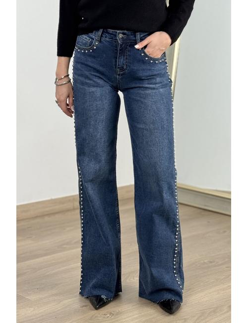 Mid-rise wide leg jeans with stud detailing on the sides and front pockets. Made from washed stretch denim fabric with a button and zip fastening. Frayed hem.