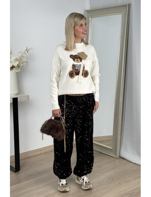 Bagggy trousers made from velvet and sequins. Elasticated waistband for a comfortable fit across multiple sizes. Elasticated hem and two side pockets. Original, elegant and comfortable trousers to make you shine like never before at your celebrations and also in your everyday, comfy outfits.