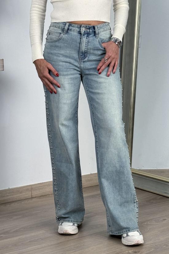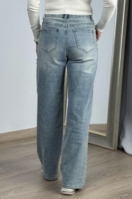 Mid-rise wide leg jeans with double row of studs on the sides. Made from washed stretch denim fabric with button and zip fastening.