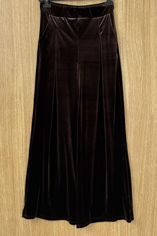 Palazzo trousers made from faux velvet. Mid-rise, front pleats and two side pockets. Elasticated waistband makes them suitable for various sizes.