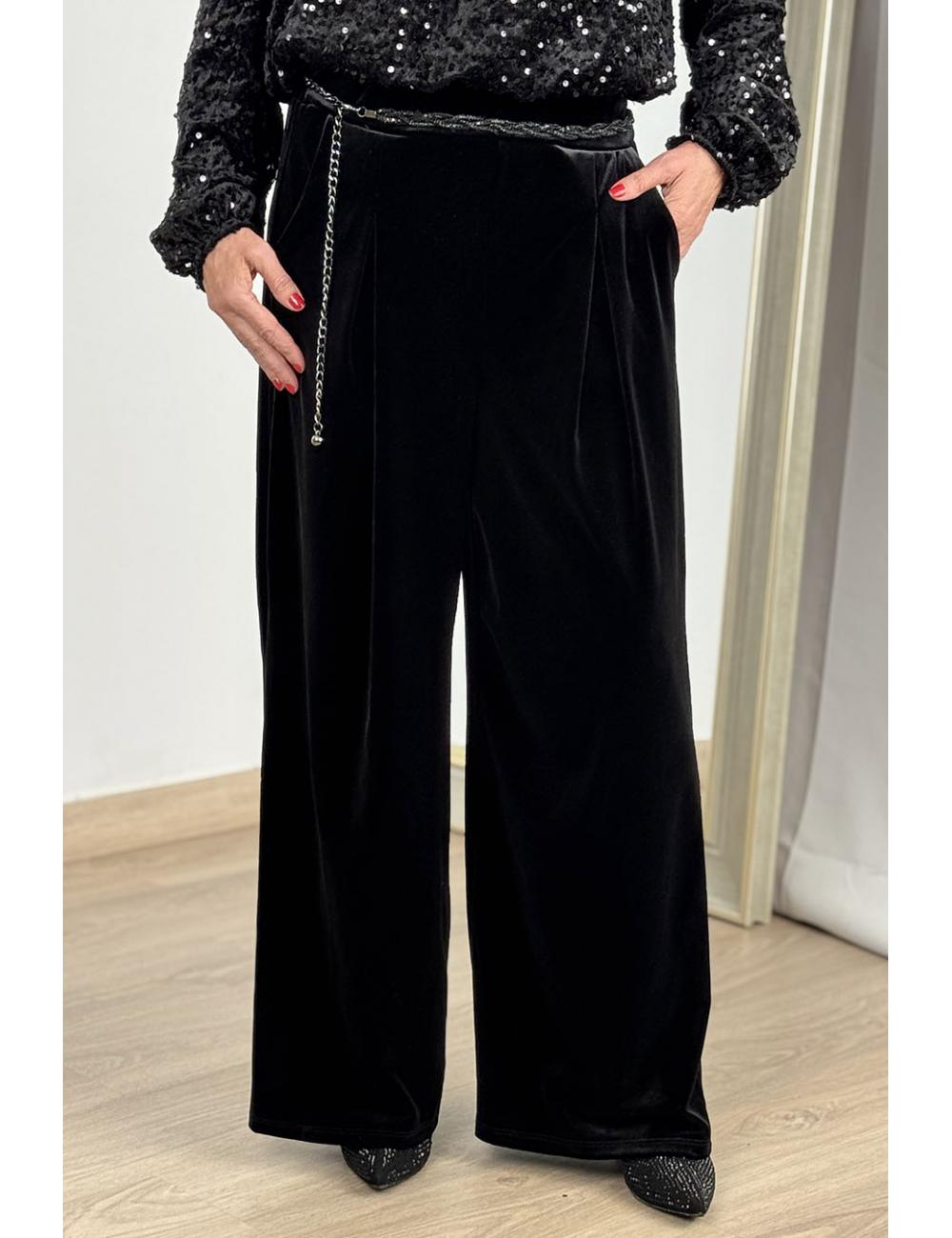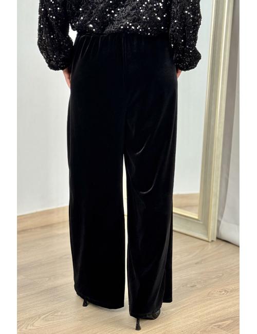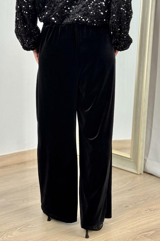 Palazzo trousers made from faux velvet. Mid-rise, front pleats and two side pockets. Elasticated waistband makes them suitable for various sizes.