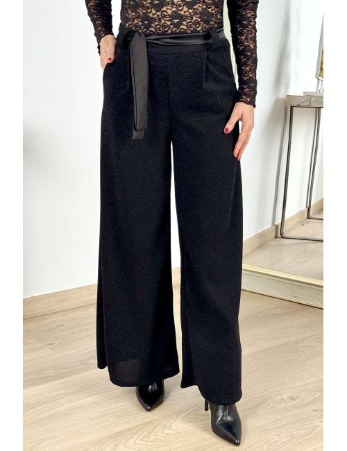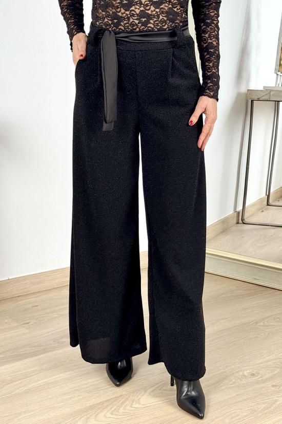 High-waisted palazzo pants made from shimmering stretch lurex fabric. An elasticated waistband makes them adjustable to various sizes. They feature two side pockets and a satin fabric belt without a buckle. These stylish and unique pants are ideal for your office looks, as well as for special occasions and celebrations.