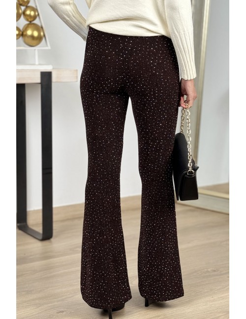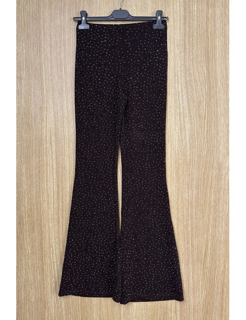 These stretch bell bottom trousers are made of shimmering lurex with rhinestone details scattered throughout. The elastic waistband makes them compatible with various sizes.