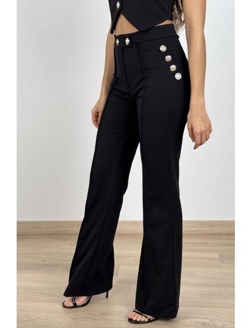 Set consisting of vest and pants made of elastic crepe fabric. Both garments have round golden buttons with embossed shield detail. The vest is short and has a tuxedo-style V lapel and is tied at the back of the collar with a wide bow of the same fabric. The pants are high-waisted, close-fitting, flared and have a decorative embossed stripe on each leg. Fastens with two buttons and zipper. It has 4 buttons arranged diagonally on both sides. An original, comfortable and especially suitable for any act, celebration or event.
