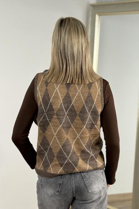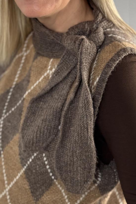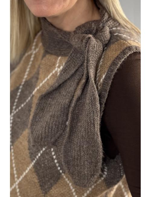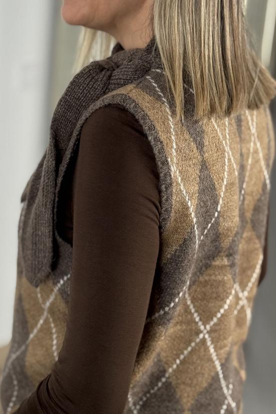 Knitted vest with diamond pattern in shades of brown, beige, and tan, with contrasting thin lines in ecru. Straight cut and round neckline with bow detail in the same fabric. Ideal for wearing with a basic T-shirt underneath or layered over shirts or dresses.