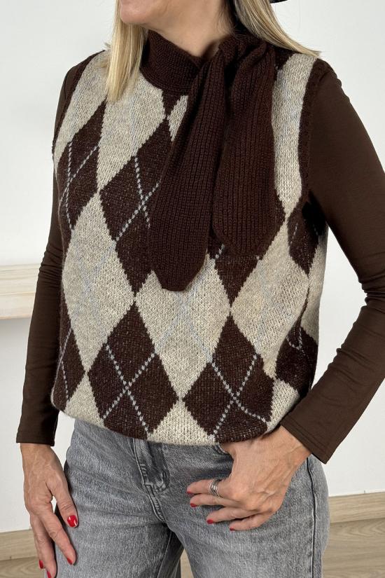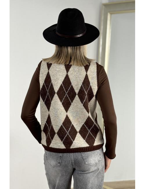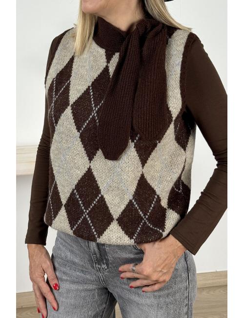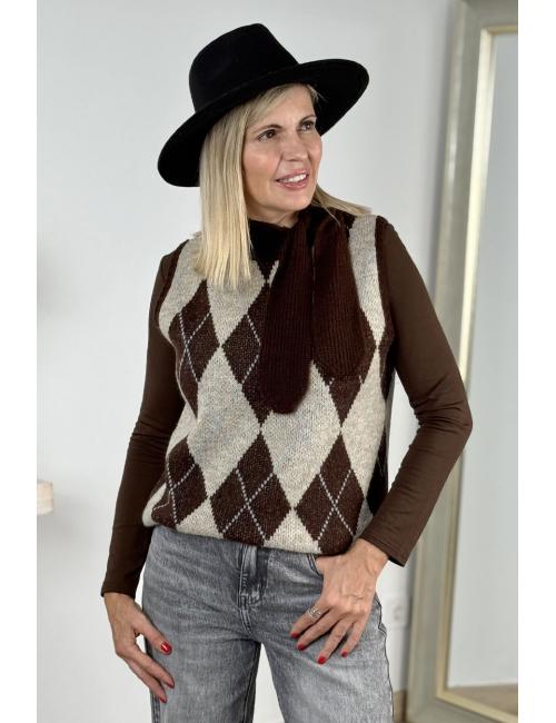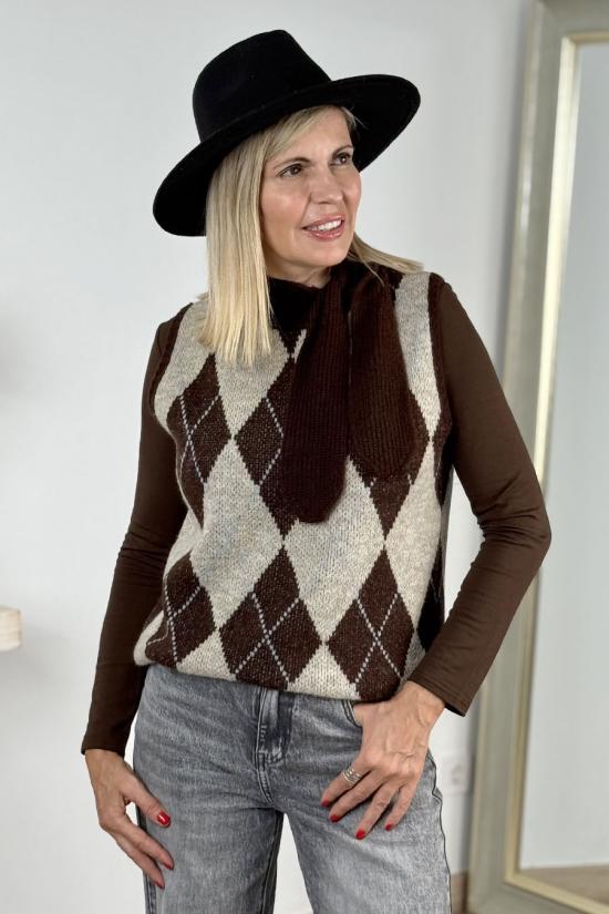 Knitted vest with diamond pattern in shades of brown, beige, and tan, with contrasting thin lines in ecru. Straight cut and round neckline with bow detail in the same fabric. Ideal for wearing with a basic T-shirt underneath or layered over shirts or dresses.