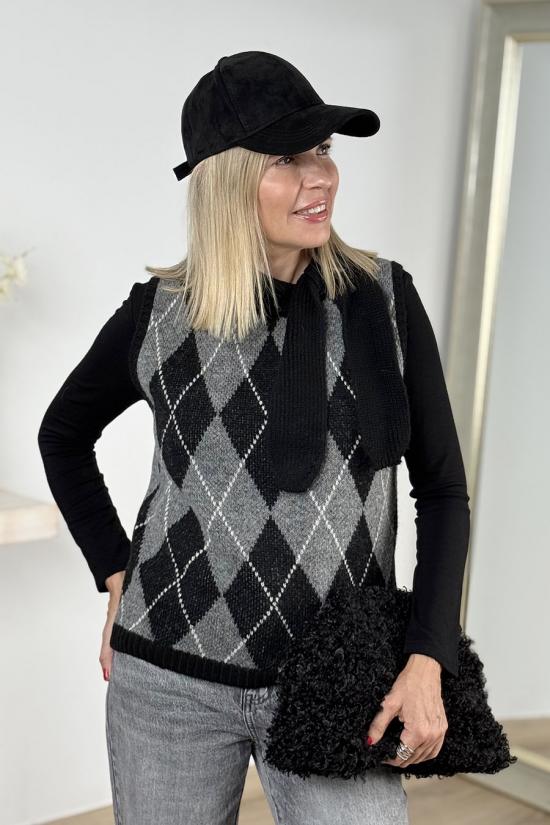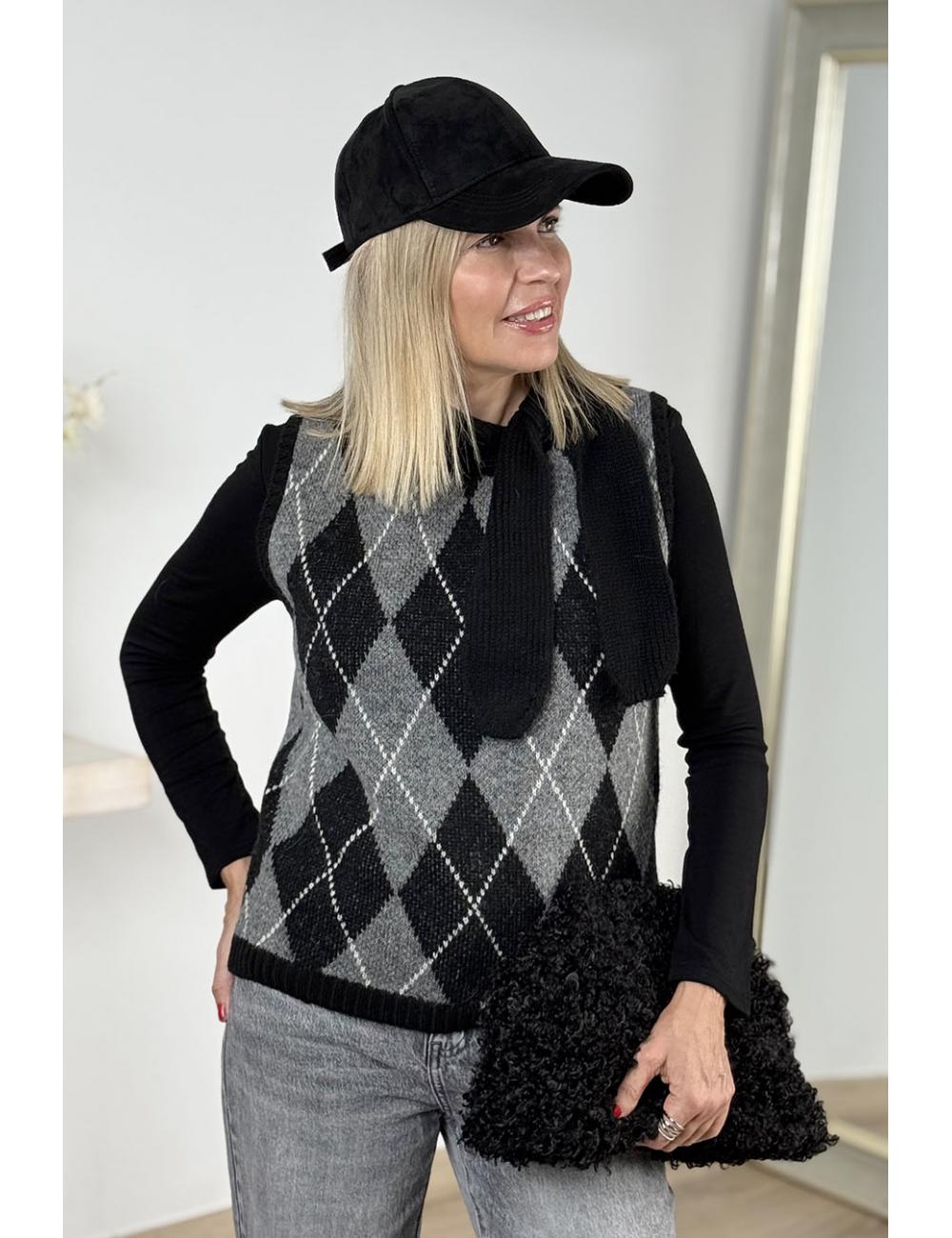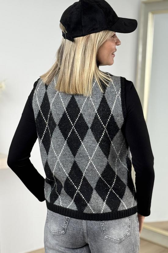 Knitted waistcoat with diamond print in black and grey tones and contrasting thin white lines. Straight cut and round neck with bow detail in the same fabric. Ideal for wearing with a basic T-shirt underneath or layered over shirts or dresses.