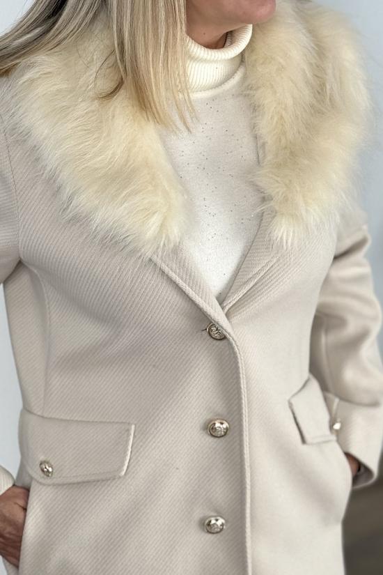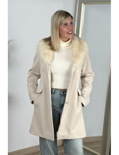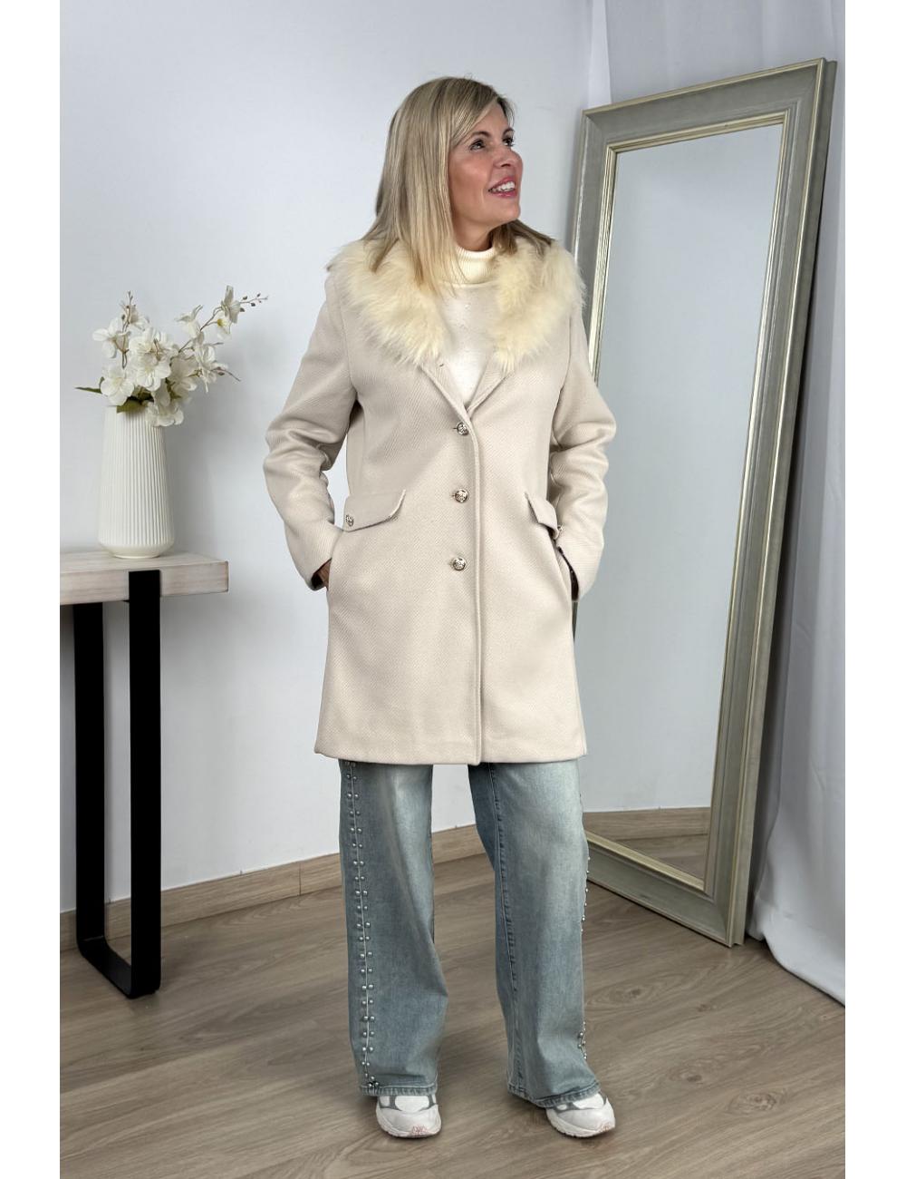 Abrigo largo midi confeccionado en textil texturado. Cuello de pelo suave extraíble. Cierre mediante 4 botones dorados y dos bolsillos laterales. Detalle de tapetas decorativas con botón que simulan bolsillos. Forro interior.