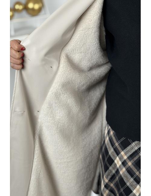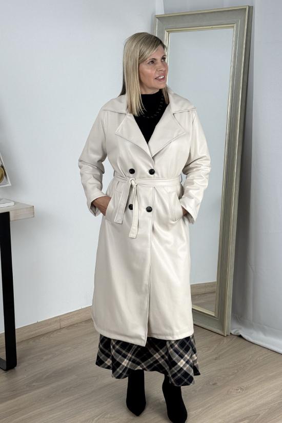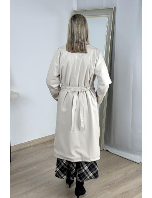 Abrigo largo confeccionado en símil piel y forro de borreguito. Solapa grande, cierre con 2 botones más dos decorativos. Cinturón en el mismo material para un mejor ajuste. Dos bolsillos laterales.