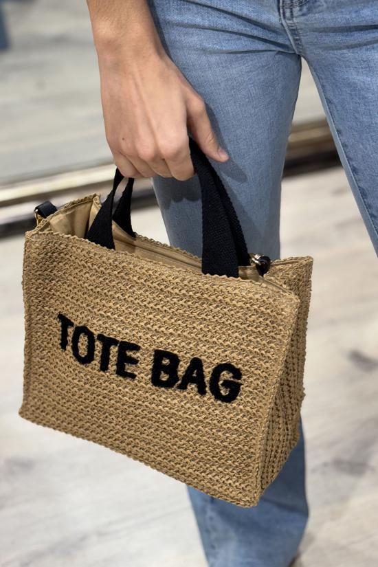 Bolso pequeño confeccionado en rafia texturada con la inscripción en relieve "Tote Bag". Incluye asas de hombro y de mano, de estilo urbano, práctico y compatible con todo tipo de outfits. Cierre con cremallera superior central.