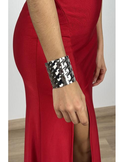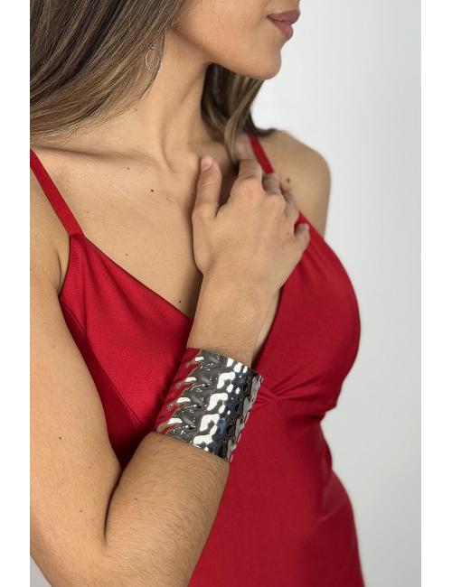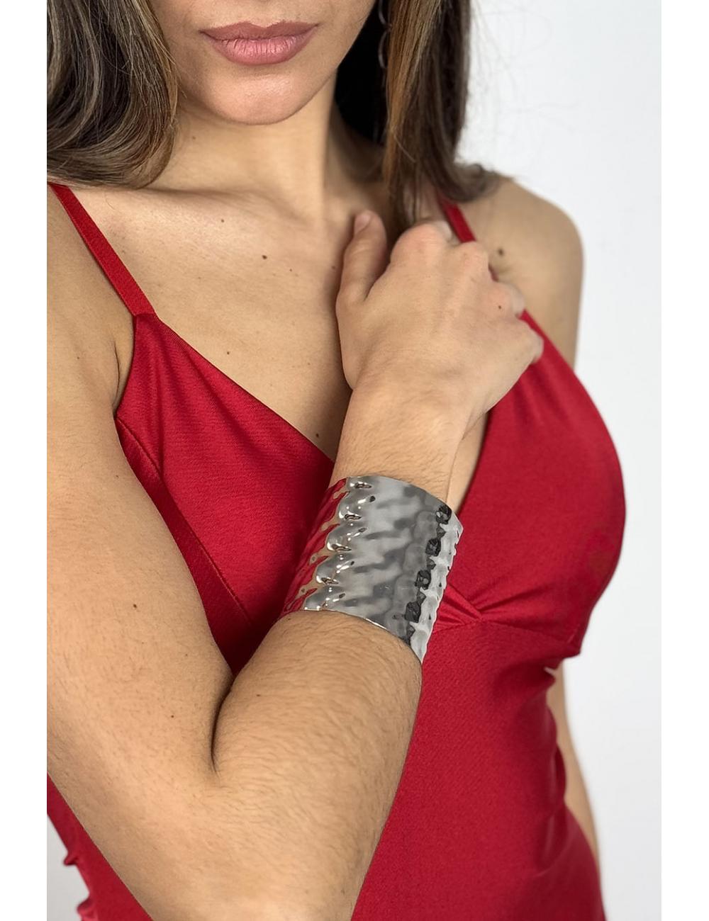 Brazalete metálico plateado con texturas onduladas en relieve. El complemento perfecto para tus outfits de invitada, graduación y eventos.