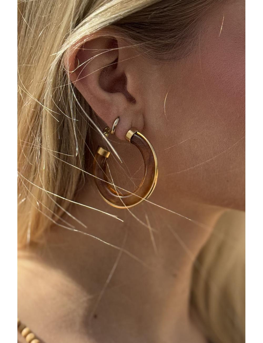 Pendientes compuestos por la pieza principal con forma de aro semi-transparente que permite el paso de la luz dando diferentes matices y tonalidades. Cierre redondo pequeño dorado. Realizados en metacrilato pulido.