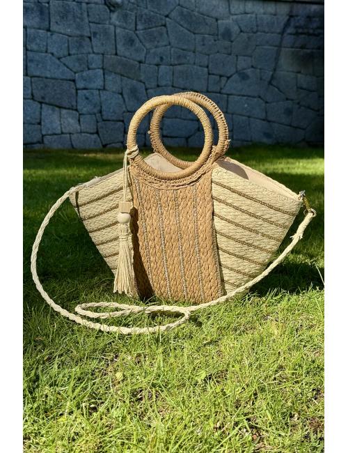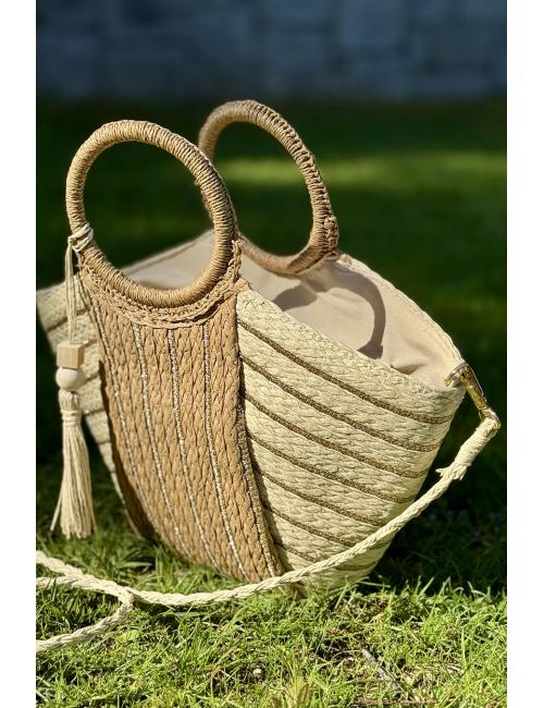 Bolso mediano estilo capazo . Asas redondas rígidas y tira al hombro extraíble. Combina rayas horizontales con rayas verticales condetalle brillante.