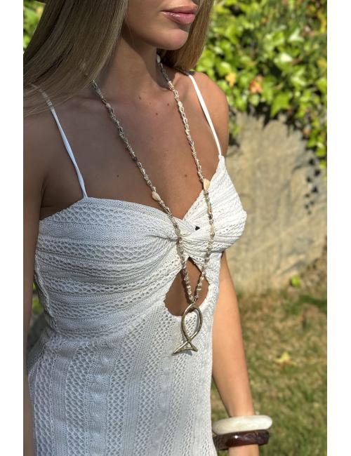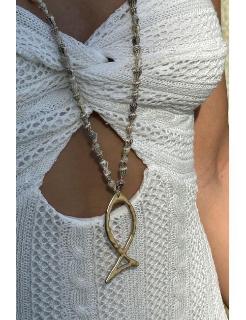 Collar largo de estilo bohemio compuesto conchas pequeñas anacaradas y pez con acabado metálico.